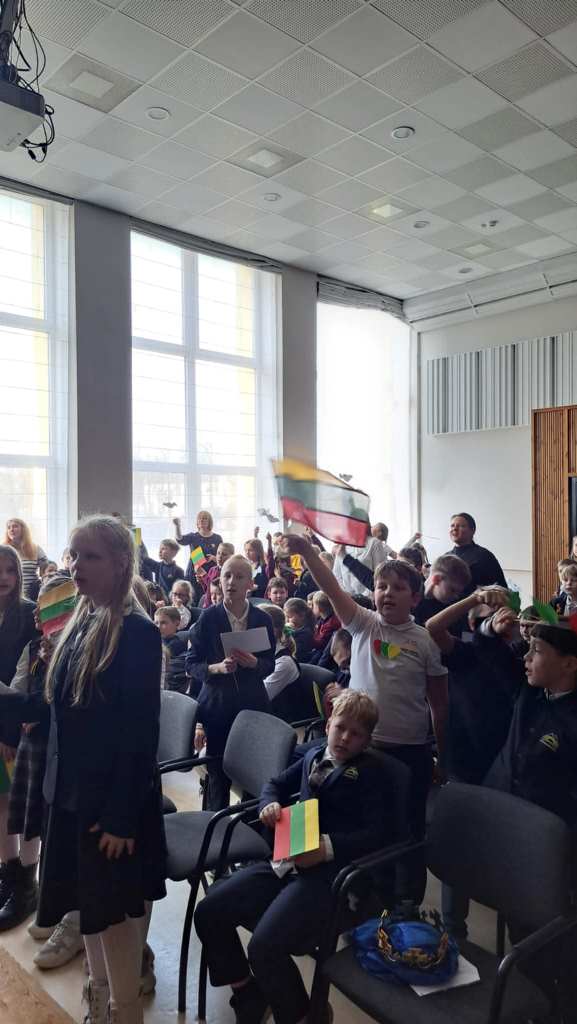Kovo 10 dieną 3c ir 4b klasės mokiniai sukvietė visus pradinukus į Gimnazijos aktų salę, kad pasveikinti Lietuvą, tėvelius, mokytojus ir vieni kitus su labai svarbia mums visiems Lietuvos Nepriklausomybės atkūrimo diena!