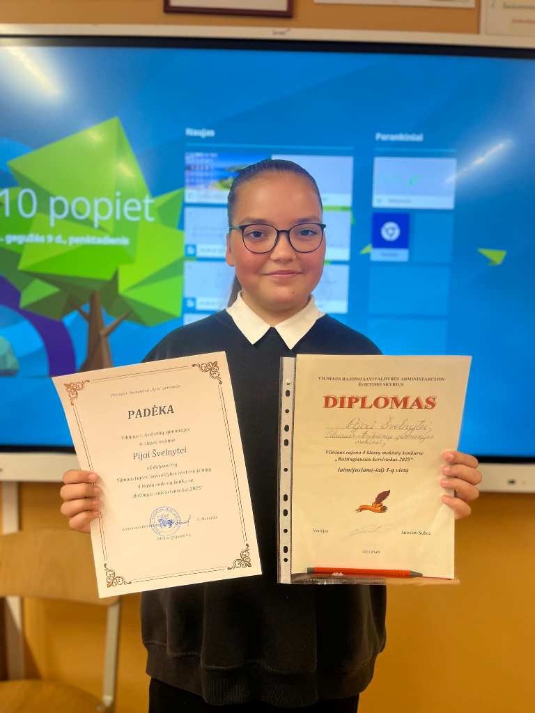 Nuoširdžiai sveikiname 4c klasės mokinę Piją Švelnytę užėmus I vietą Vilniaus rajono švietimo įstaigų 3–4 klasių konkurse „Raštingiausias ketvirtokas 2025“! Didžiuojamės Tavo pasiekimu ir linkime toliau drąsiai siekti žinių aukštumų!