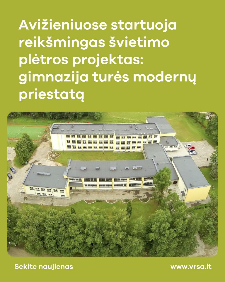 Vilniaus rajone pradedamas įgyvendinti svarbus švietimo infrastruktūros plėtros projektas – Avižienių gimnazija turės naują trijų aukštų priestatą. Gegužės 15 d. pasirašyta daugiau nei 2,7 mln. eurų vertės rangos darbų sutartis, kurios pagrindu numatyta iš esmės modernizuoti ugdymo sąlygas ir gerokai padidinti šios gimnazijos pajėgumus.