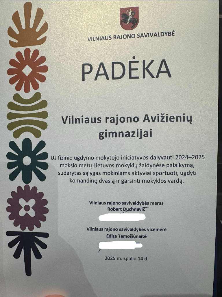 Vilniaus rajono Avižienių gimnazija apdovanota Vilniaus rajono savivaldybės padėka už fizinio ugdymo mokytojų iniciatyvą, aktyvų dalyvavimą Lietuvos mokyklų žaidynėse, mokinių sportinio aktyvumo, tinklinio ir komandinės dvasios puoselėjimą. Nuoširdi Padėka mūsų fizinio ugdymo mokytojams ir treneriams Valdemarui Šumskui ir Viačeslavui Verbovik