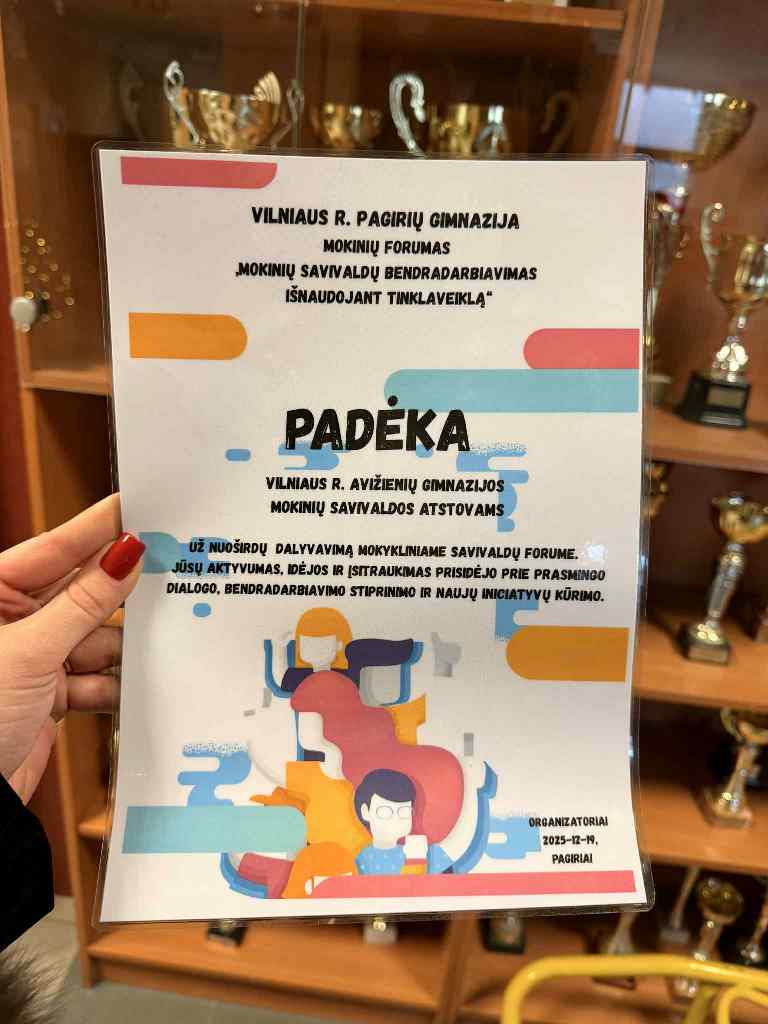 2025 m. gruodžio 19 d. Vilniaus r. Pagirių gimnazijoje vyko „Tūkstantmečio mokyklų II“ (TŪM) Vilniaus r. mokyklų forumas „Mokinių savivaldų bendradarbiavimas išnaudojant tinklaveiklą“, kurio šūkis – „Ryšiai kuria veiksmą“.