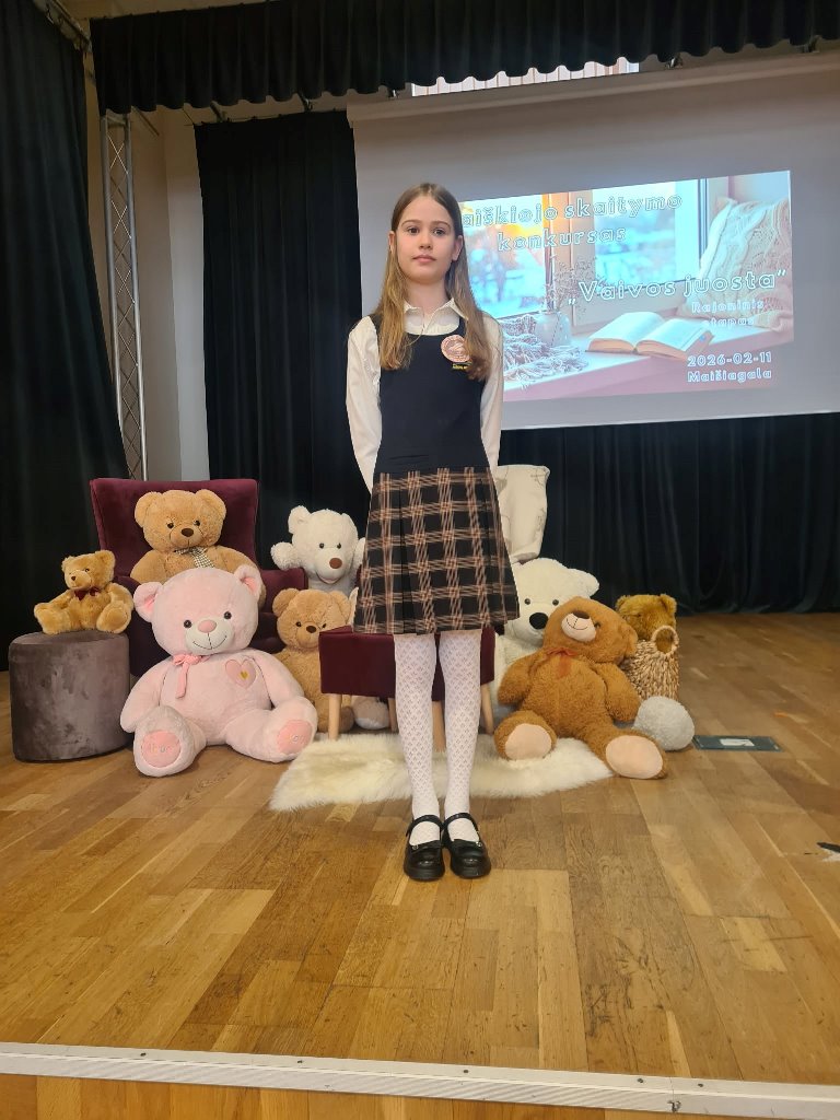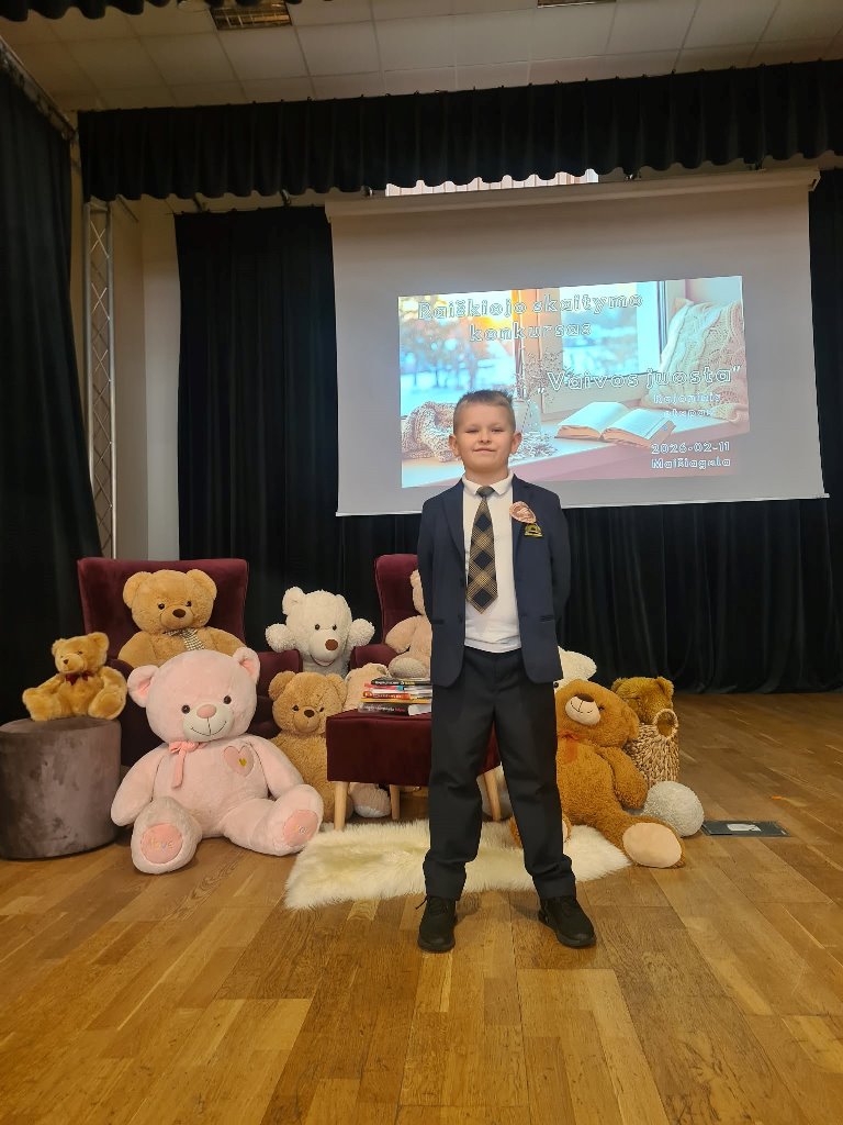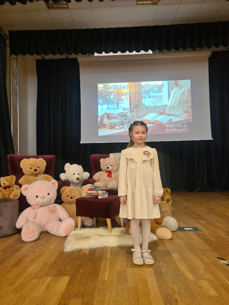 Mūsų mažieji skaitovai buvo drąsūs, įtaigūs ir parsivežė padėkas ne tik sau, bet ir konkursui pasirengti padėjusiom mokytojom. Dominykui buvo įteiktas prizas už aiškią ir skambią kalbą (mokyt. Edita Šafranovičienė), Vaidilei-padėka (mokyt. Dovilė Baranovskienė), o Smiltė tapo III-ios vietos laimėtoja (mokyt. Nida Pileckienė)!