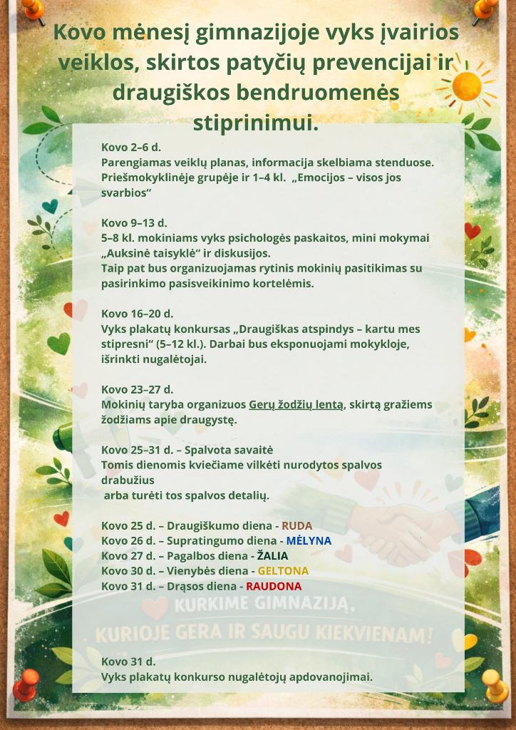 Mokinių lauks klasės valandėlės, psichologės paskaitos, kūrybinės veiklos, Gerų žodžių lenta bei spalvota savaitė, skatinanti vienybę ir pozityvias emocijas. Tikime, kad mažais kasdieniais pasirinkimais galime kurti saugesnę ir šiltesnę gimnazijos aplinką.