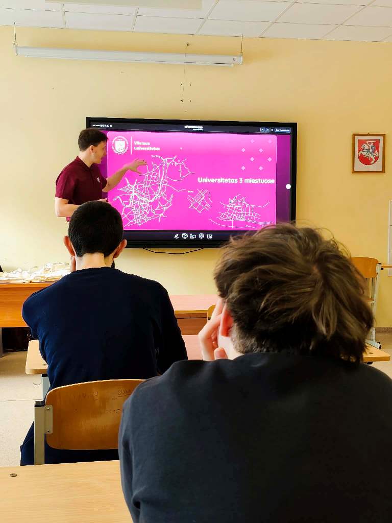 Susitikimo metu mokiniai sužinojo apie įvairias studijų kryptis, studijų organizavimą bei saviraiškos galimybes studijuojant universitete. Pranešėjas taip pat pasidalijo naudingomis įžvalgomis apie studijų pasirinkimą ir atsakė į mokinių klausimus.
