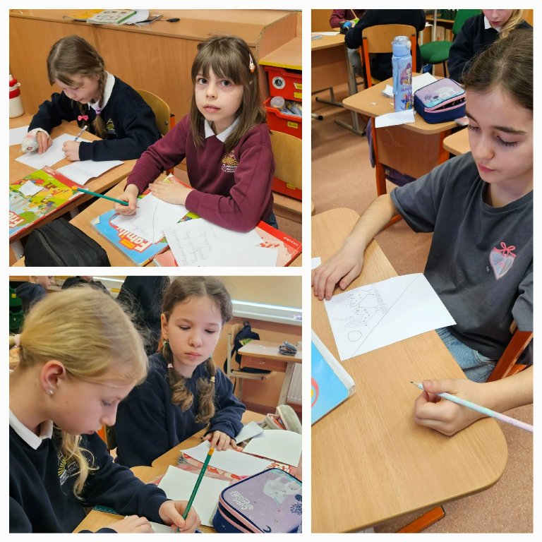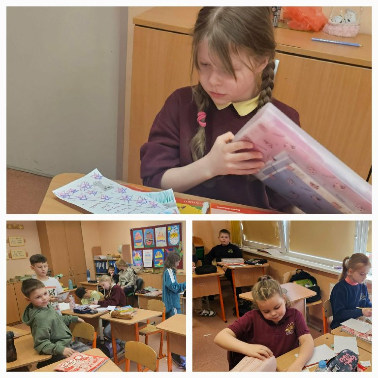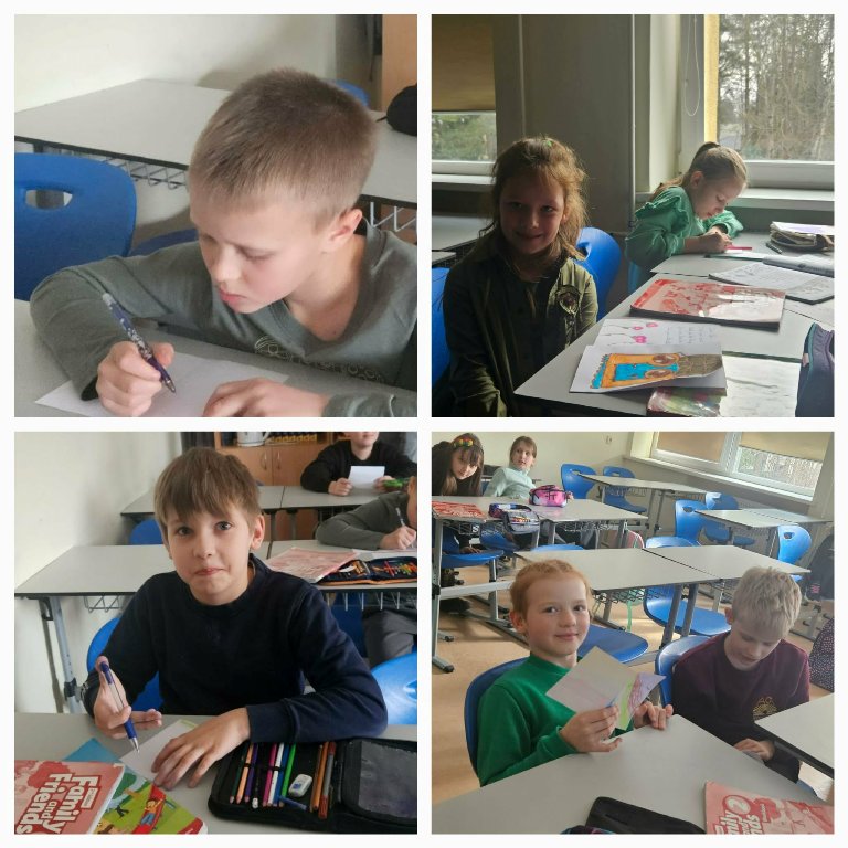 3a ir 3c klasių mokiniai per anglų kalbos pamoką kūrė atvirukus su padėkomis ir komplimentais