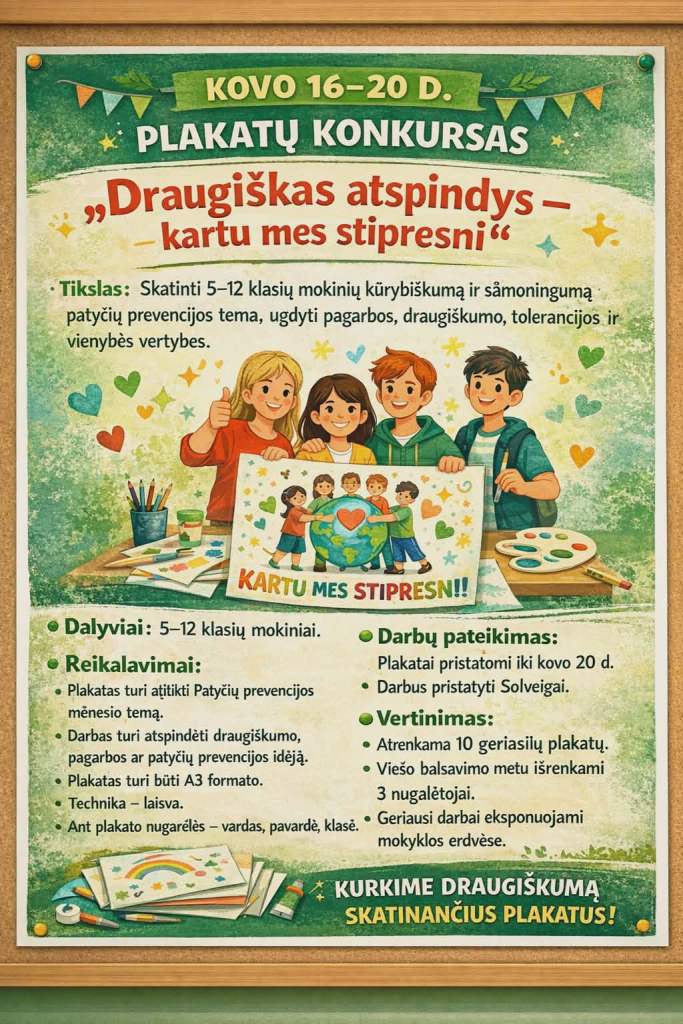Kovo 16–20 d. plakatų konkursas „Draugiškas atspindys – kartu mes stipresni“ Kviečiame 5–12 klasių mokinius dalyvauti kūrybiniame konkurse patyčių prevencijos tema. Darbus (A3 formato) pristatyti iki kovo 20 d. Darbus pristatyti socialinei pedagogei Solveigai. Kurkime draugiškesnę mokyklą – kartu mes stipresni!Read More
