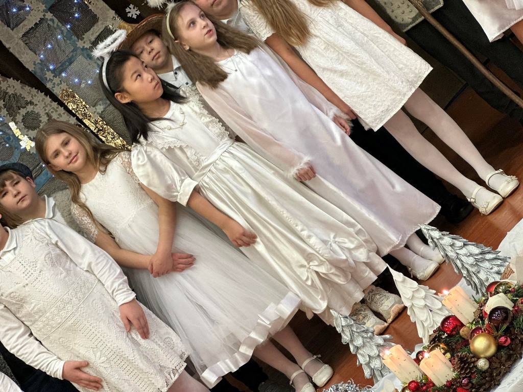 W dniu 19 grudnia w naszym gimnazjum odbyło się tradycyjnie spotkanie opłatkowe dla klas polskich. Klasa szósta przygotowała program nawiązując do atmosfery oczekiwania Świąt, a początkòwka uświetniła imprezę barwnymi strojami i wykonaniem kolęd.