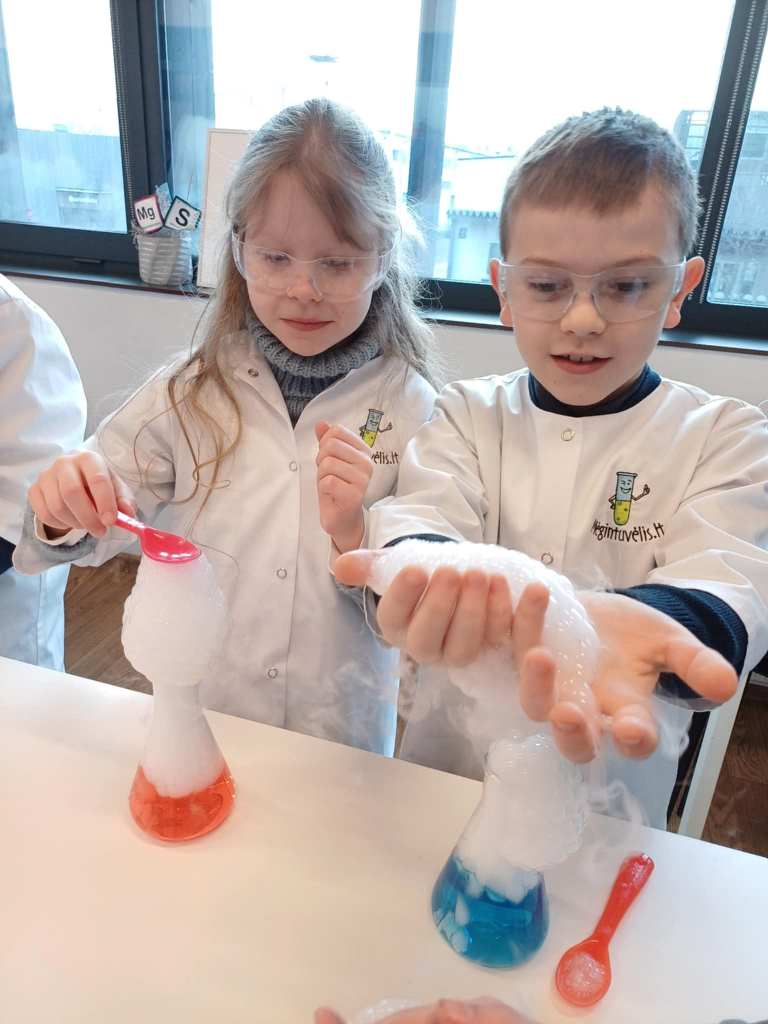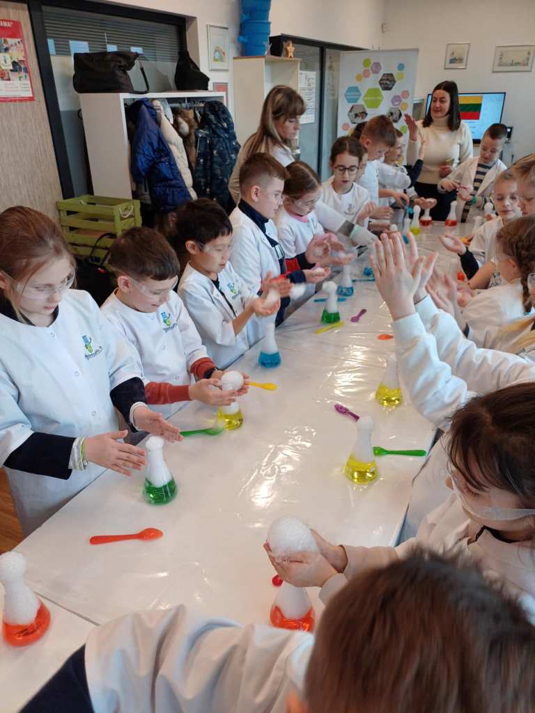 12 lutego uczniowie 2a, 3a klas mieli wspaniałą lekcję w laboratorium „Mėgintuvėlis”. Podczas edukacji uczniowie założyli okulary ochronne, fartuchy, następnie poznali i spróbowali ciekawych eksperymentów chemicznych.